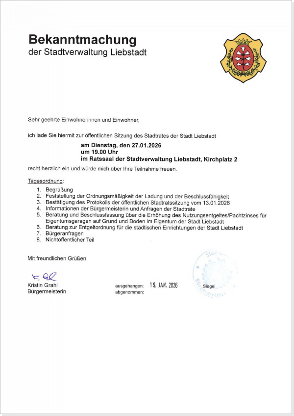 Auszug aus dem Protokoll der öffentlichen Sitzung des Stadtrates der Stadt Liebstadt vom 13.01.2026