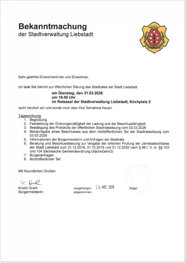 Auszug aus dem Protokoll der öffentlichen Sitzung des Stadtrates der Stadt Liebstadt vom 31.03.2026